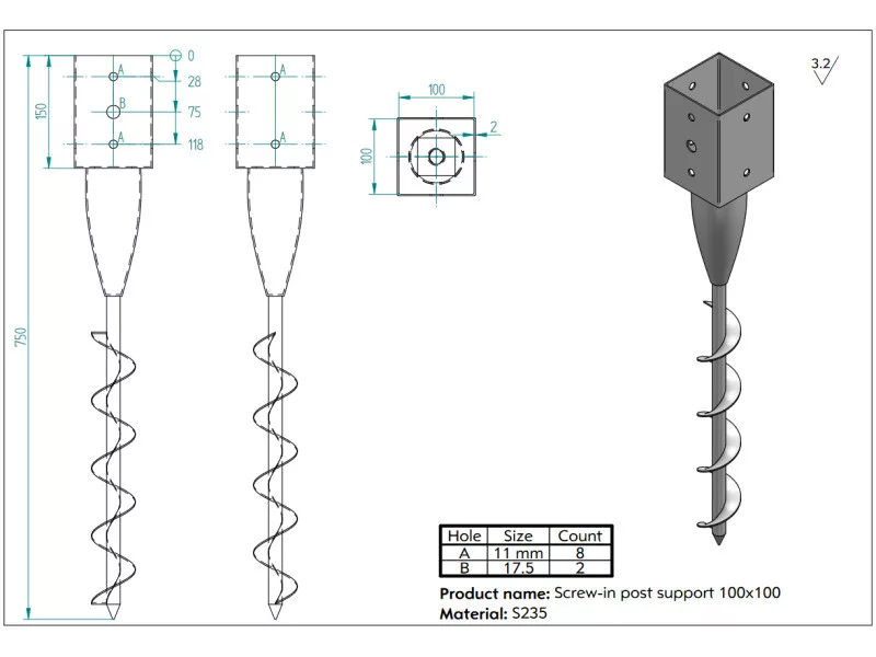 Talajcsavar zártszelvényekhez 100x100x750
