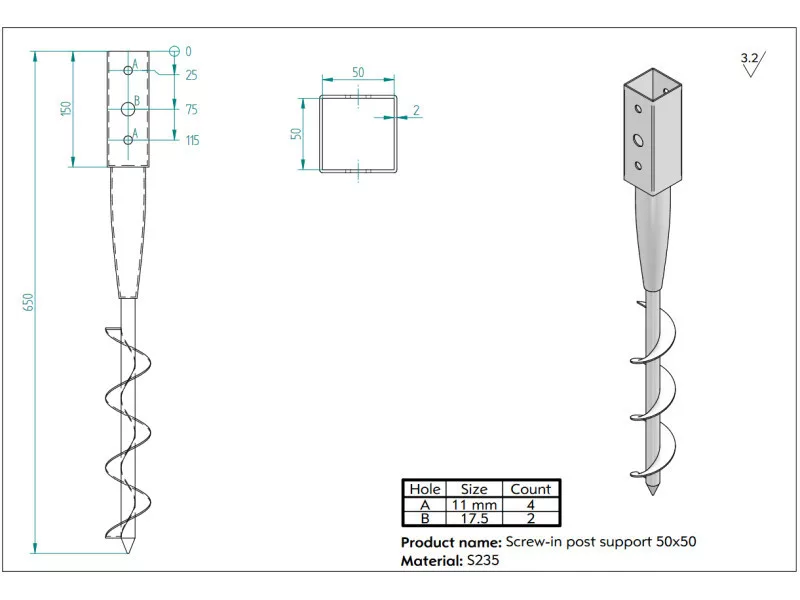 Talajcsavar zártszelvényekhez 50x50x650