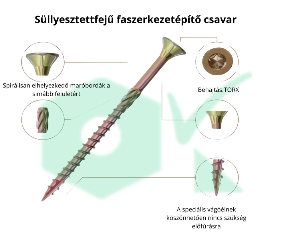 Süllyesztettfejű faszerkezetépítő csavar, sárgahorganyzott 6x150/60 egy speciális, nagy szilárdságú rögzítőelem, amelyet fa szerkezetek, például tetőszerkezetek, gerendák, oszlopok és egyéb faépítmények összekapcsolására és rögzítésére használnak. Ezek a csavarok jellemzően erősebbek és hosszabbak, mint a hagyományos facsavarok, és sok esetben helyettesíthetik a hagyományos ácskapcsokat, szegeket vagy menetes szárakat.